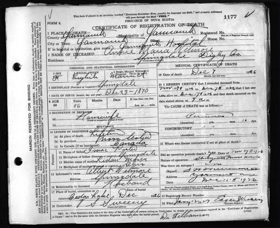 Death Registration: Year: 1926 file: 111 number: 1177