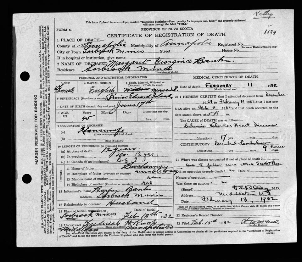 Death Registration: Year: 1932 file: 115 number: 1184
