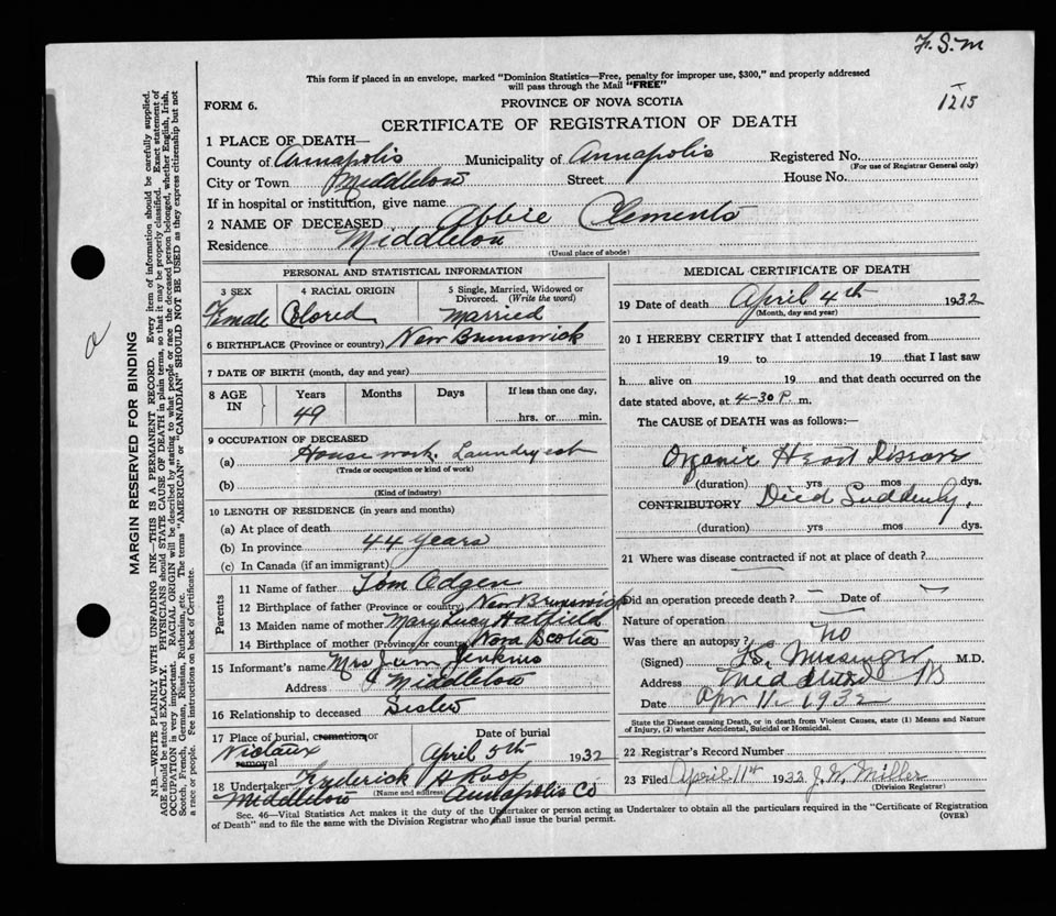 Death Registration: Year: 1932 file: 115 number: 1215