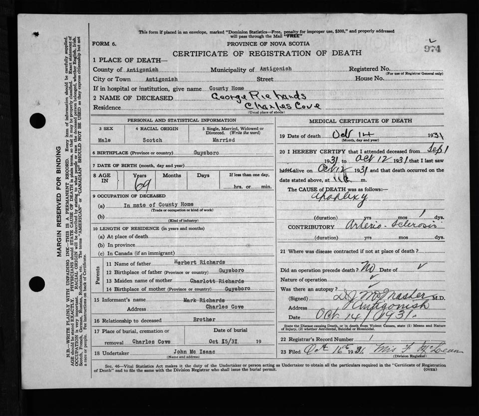 Male Death Registration: Year: 1931 file: 116 number: 974