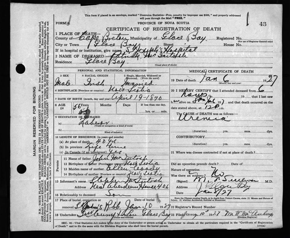 Male Death Registration: Year: 1927 file: 117 number: 43