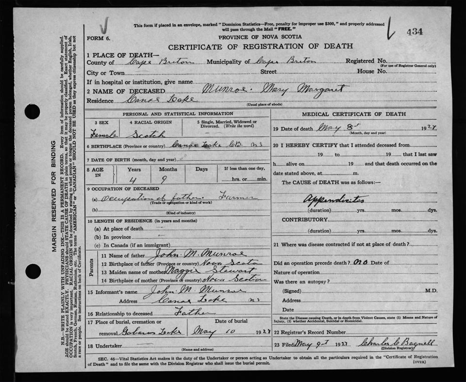 Female Death Registration: Year: 1927 file: 117 number: 434