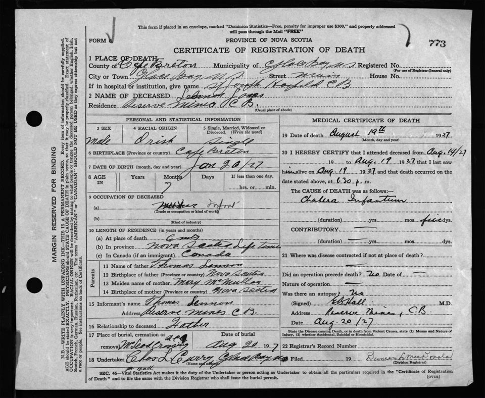 Death Registration: Year: 1927 file: 117 number: 773