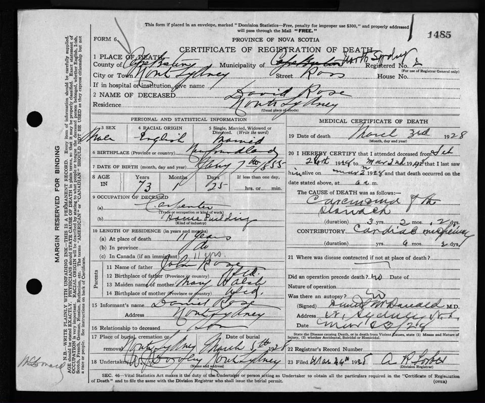 Male Death Registration: Year: 1928 file: 117 number: 1485