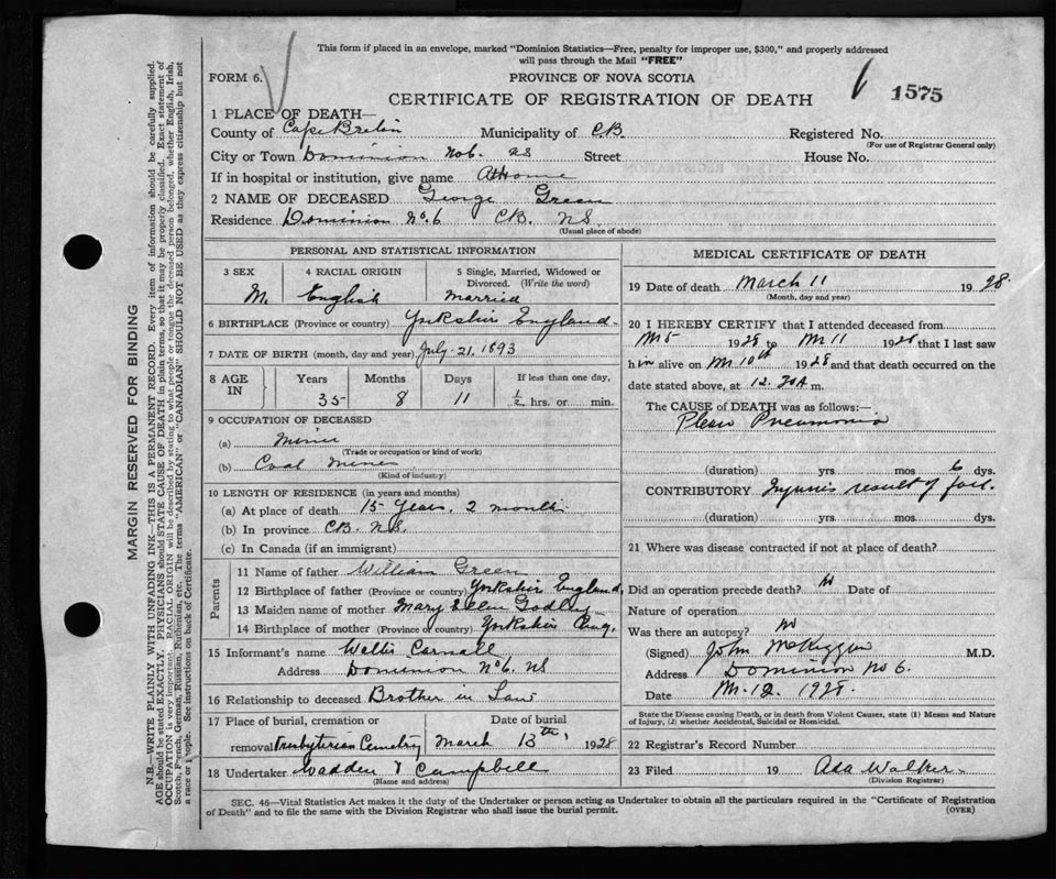 Male Death Registration: Year: 1928 file: 117 number: 1575
