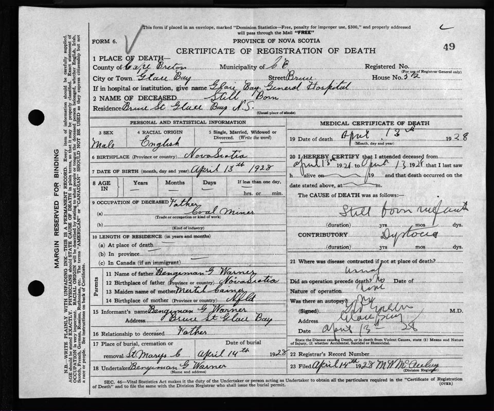 Male Death Registration: Year: 1928 file: 118 number: 49