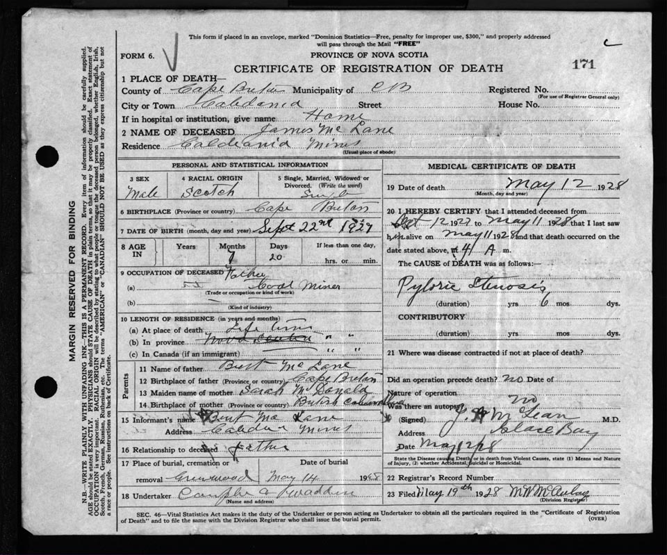 Male Death Registration: Year: 1928 file: 118 number: 171