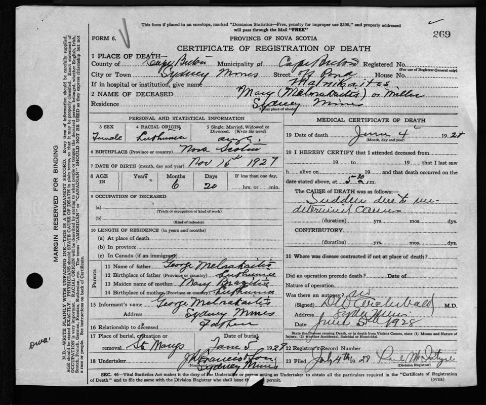 Death Registration: Year: 1928 file: 118 number: 269