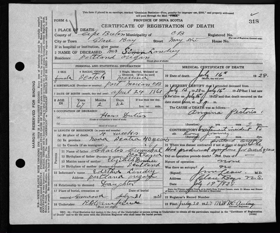 Death Registration: Year: 1928 file: 118 number: 318