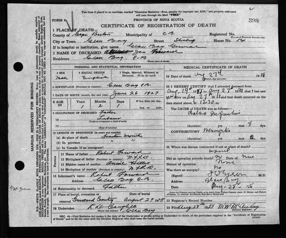 Male Death Registration: Year: 1928 file: 118 number: 398