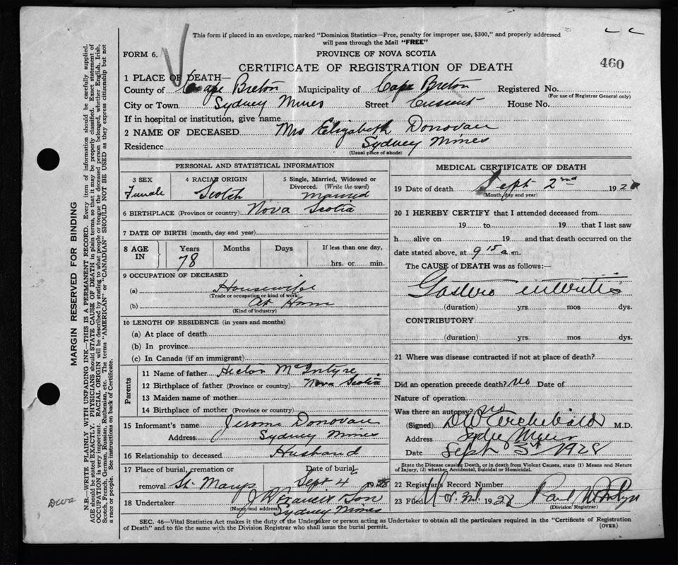 Female Death Registration: Year: 1928 file: 118 number: 460