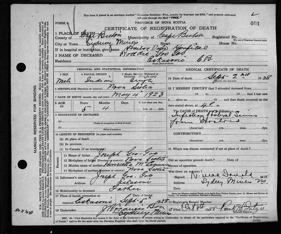 Male Death Registration: Year: 1928 file: 118 number: 461