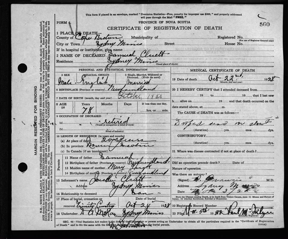 Male Death Registration: Year: 1928 file: 118 number: 560