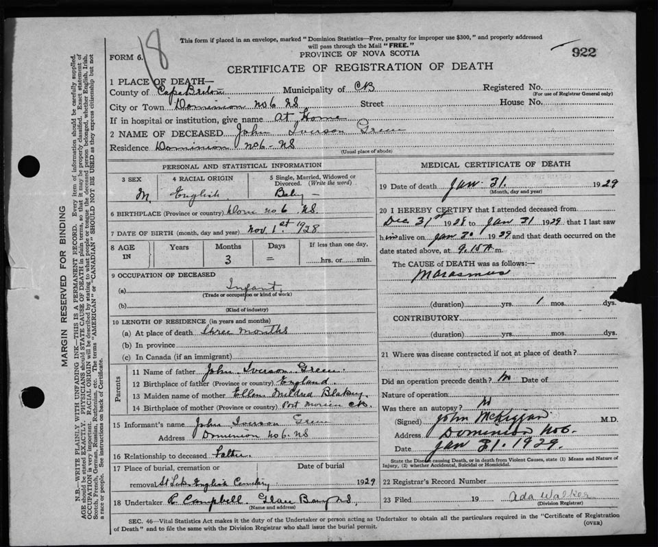 Male Death Registration: Year: 1929 file: 118 number: 922