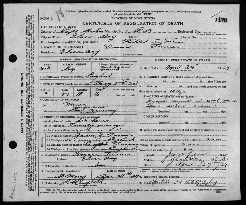 Male Death Registration: Year: 1929 file: 118 number: 1178