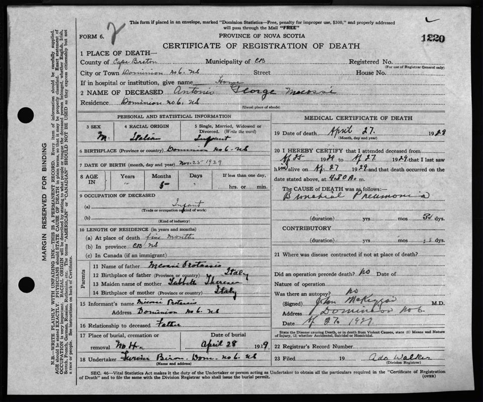 Death Registration: Year: 1929 file: 118 number: 1220