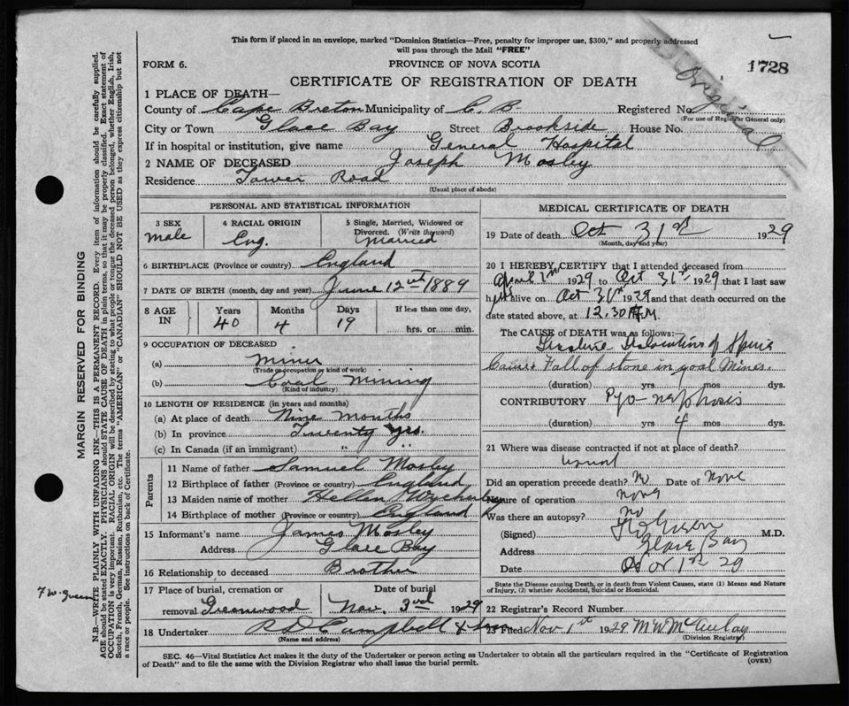 Male Death Registration: Year: 1929 file: 118 number: 1728