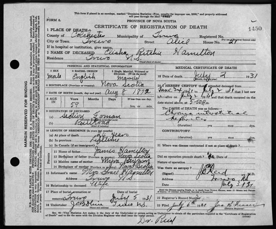 Male Death Registration: Year: 1931 file: 119 number: 1450