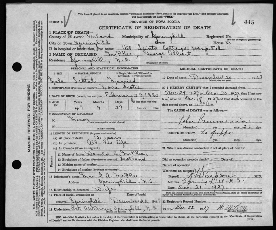 Male Death Registration: Year: 1927 file: 120 number: 445