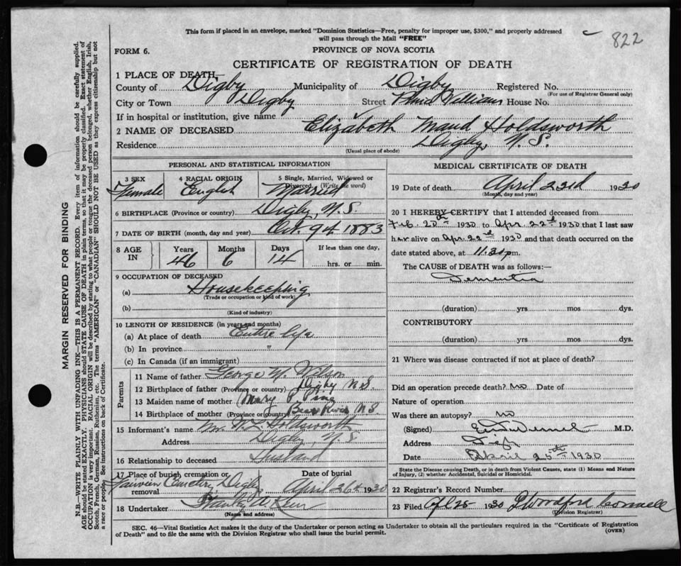 Female Death Registration: Year: 1930 file: 121 number: 822