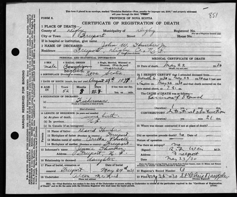 Male Death Registration: Year: 1930 file: 121 number: 851