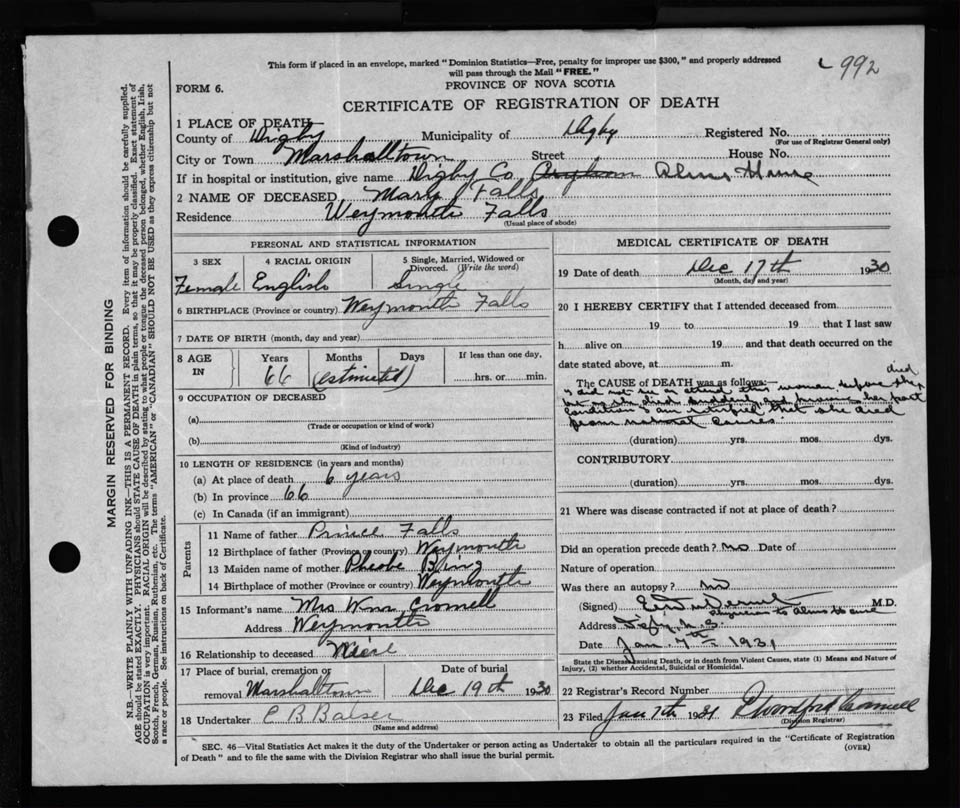 Female Death Registration: Year: 1930 file: 121 number: 992