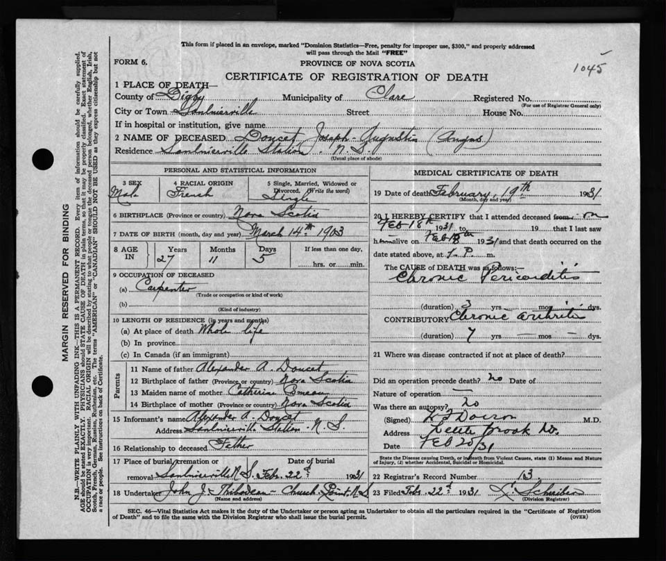 Male Death Registration: Year: 1931 file: 121 number: 1045