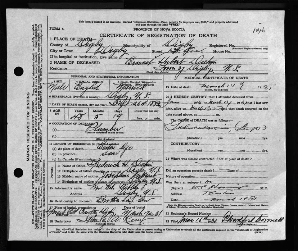 Male Death Registration: Year: 1931 file: 121 number: 1046