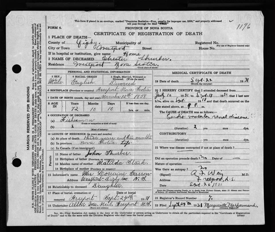 Male Death Registration: Year: 1931 file: 121 number: 1176