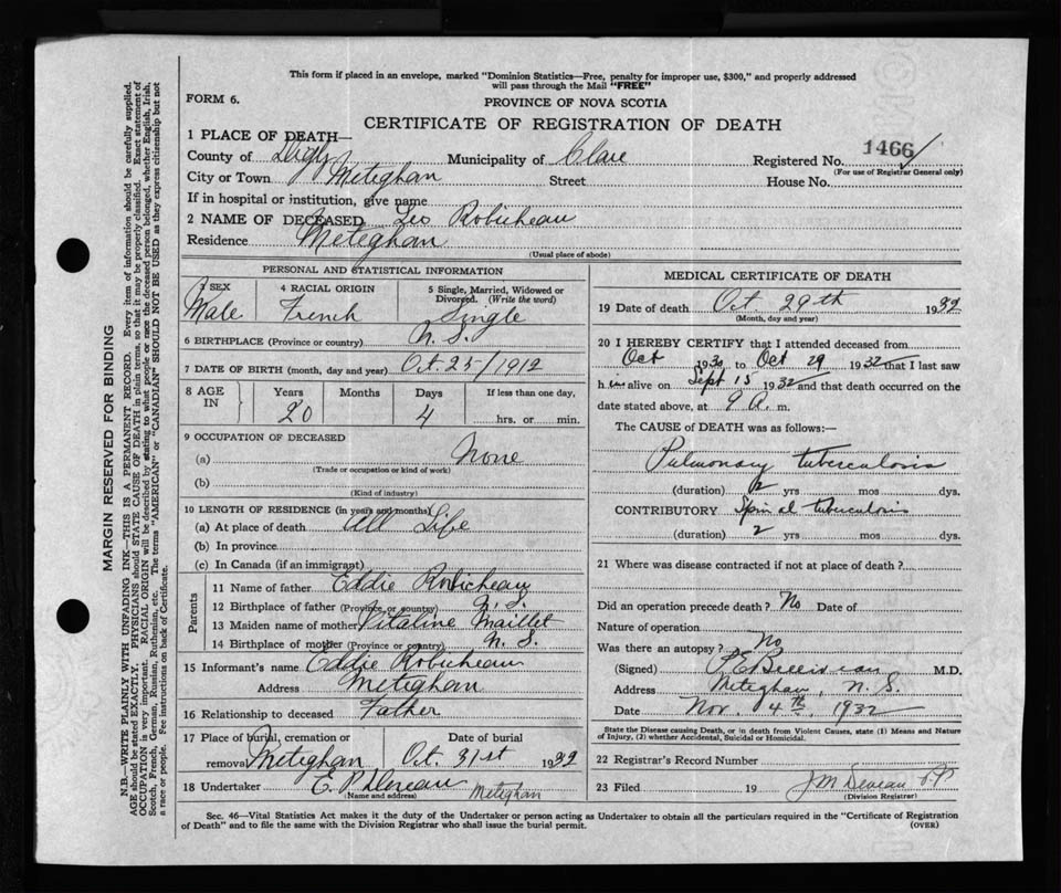 Male Death Registration: Year: 1932 file: 121 number: 1466
