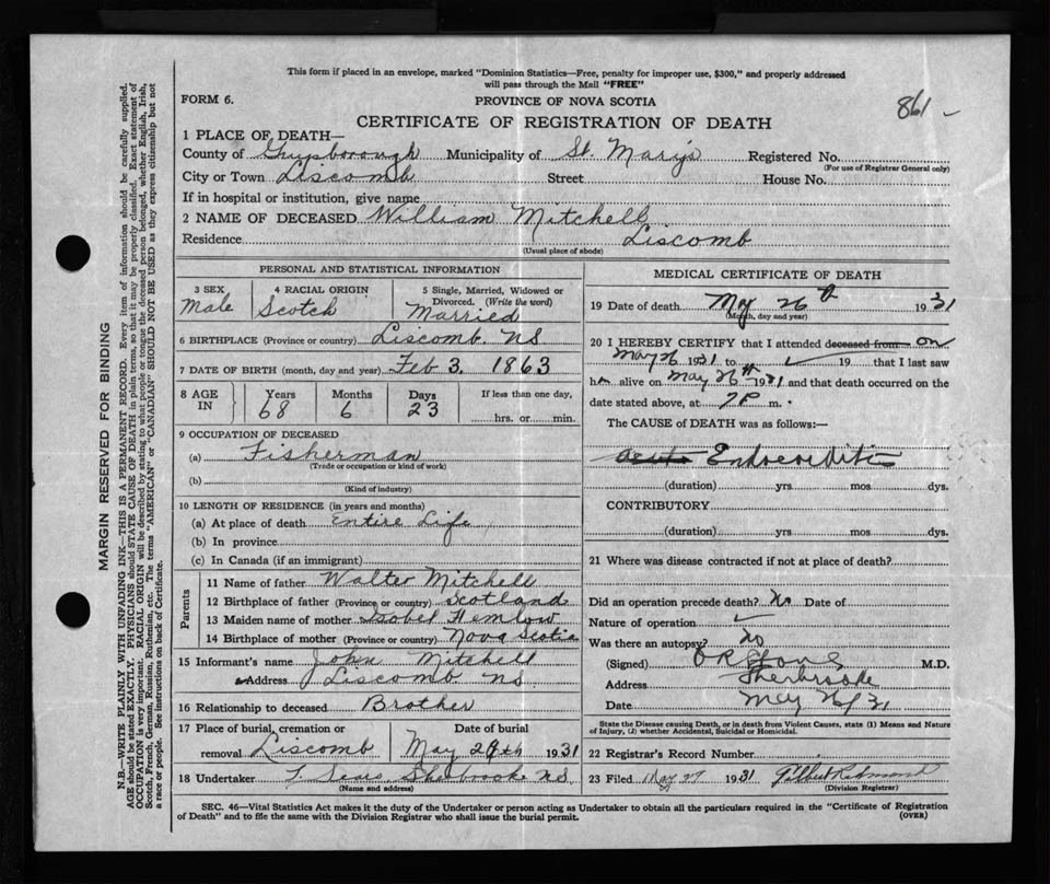 Male Death Registration: Year: 1931 file: 122 number: 861