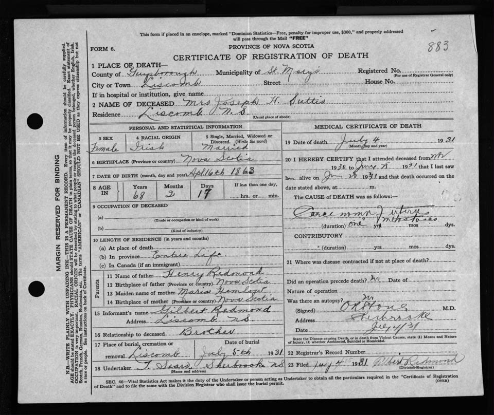 Female Death Registration: Year: 1931 file: 122 number: 883