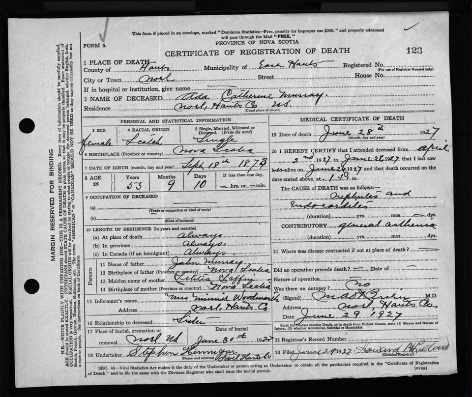 Female Death Registration: Year: 1927 file: 124 number: 123