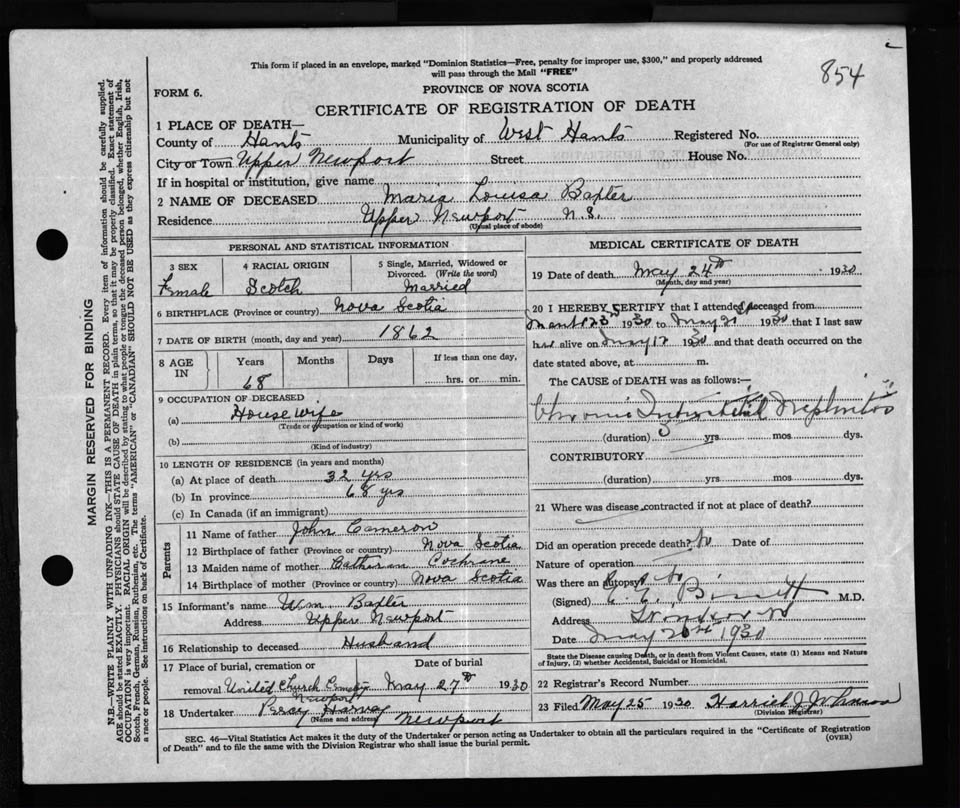 Female Death Registration: Year: 1930 file: 124 number: 854
