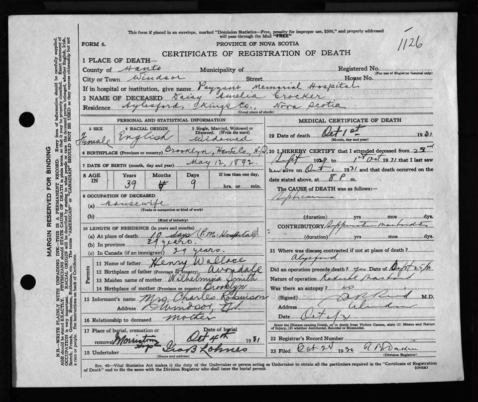 Female Death Registration: Year: 1931 file: 124 number: 1126