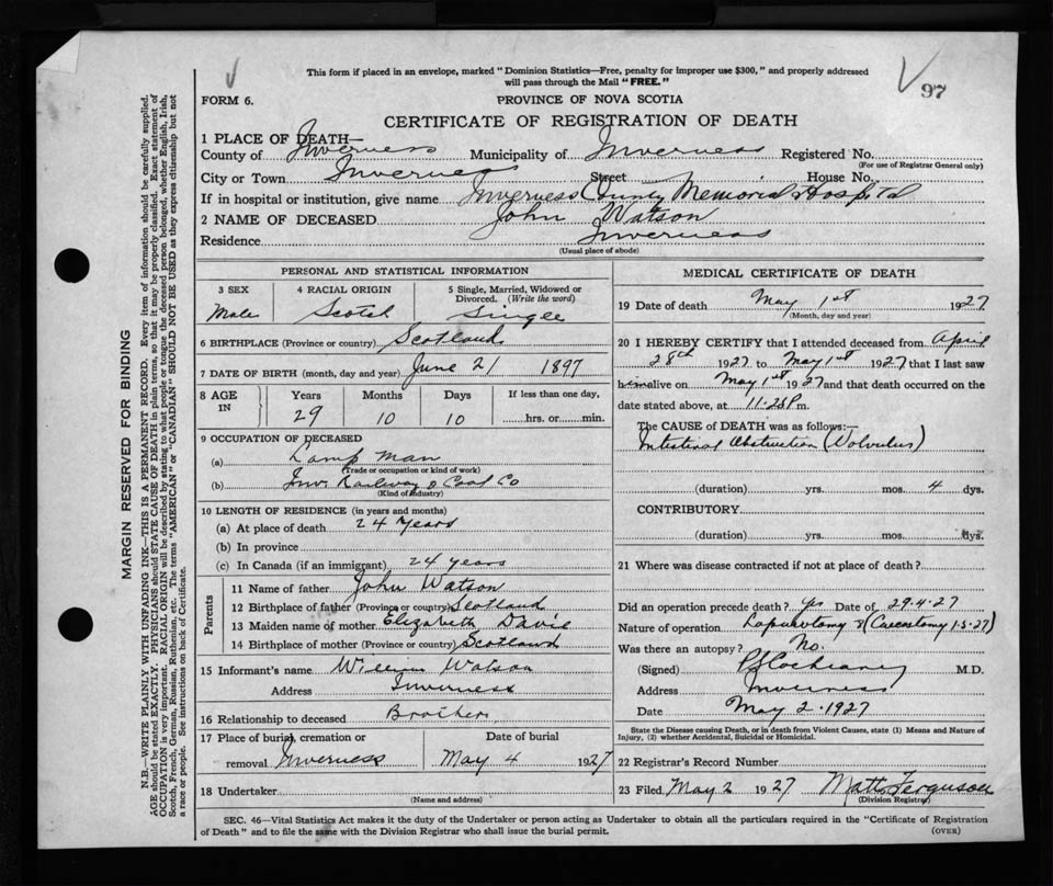 Male Death Registration: Year: 1927 file: 125 number: 97
