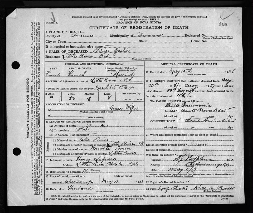 Female Death Registration: Year: 1927 file: 125 number: 105
