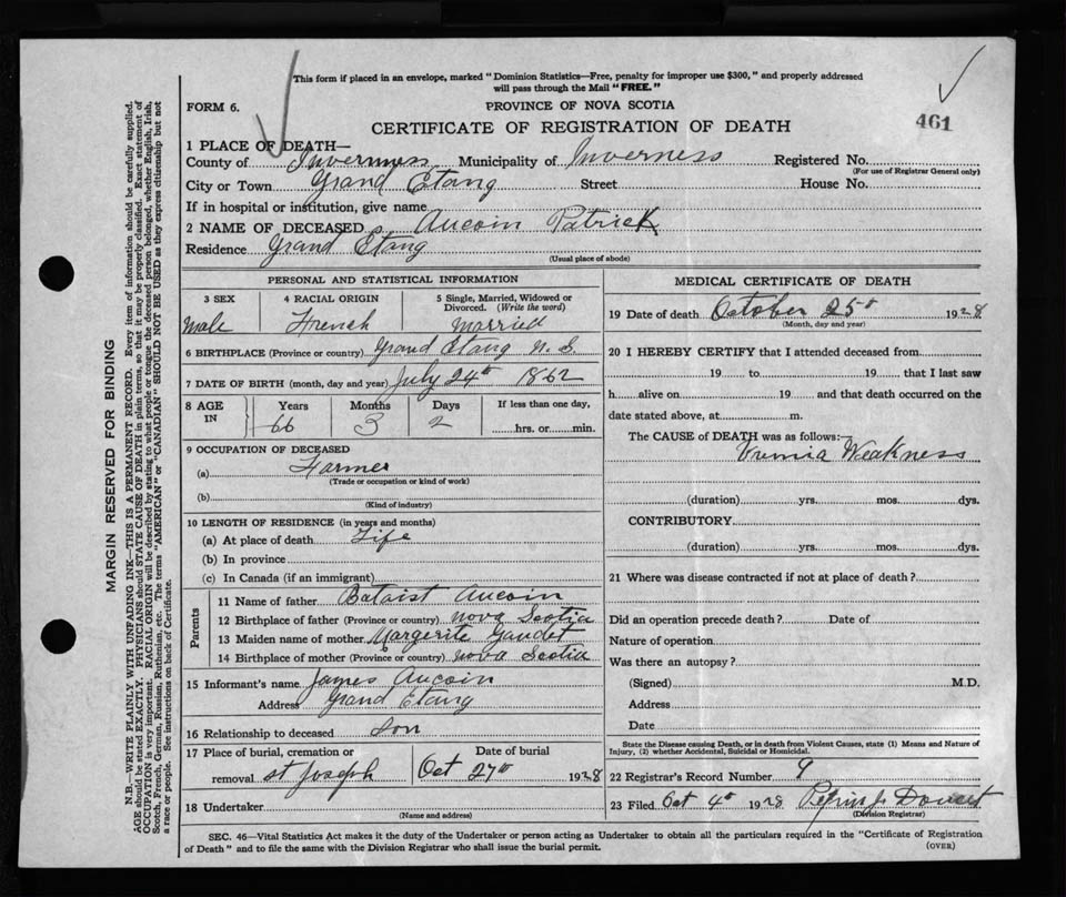 Male Death Registration: Year: 1928 file: 125 number: 461
