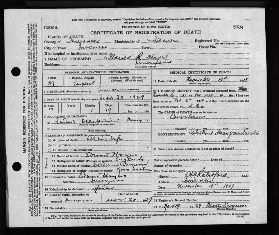 Male Death Registration: Year: 1929 file: 125 number: 788