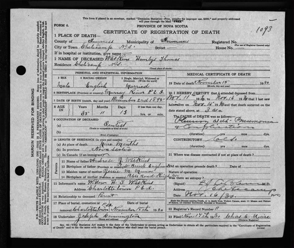 Male Death Registration: Year: 1930 file: 125 number: 1093