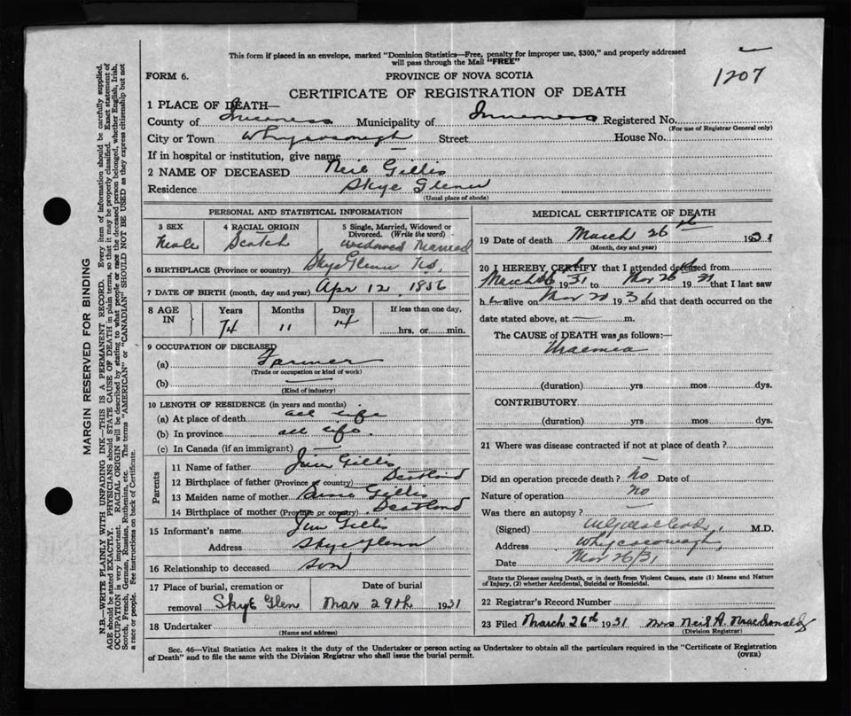 Male Death Registration: Year: 1931 file: 125 number: 1207
