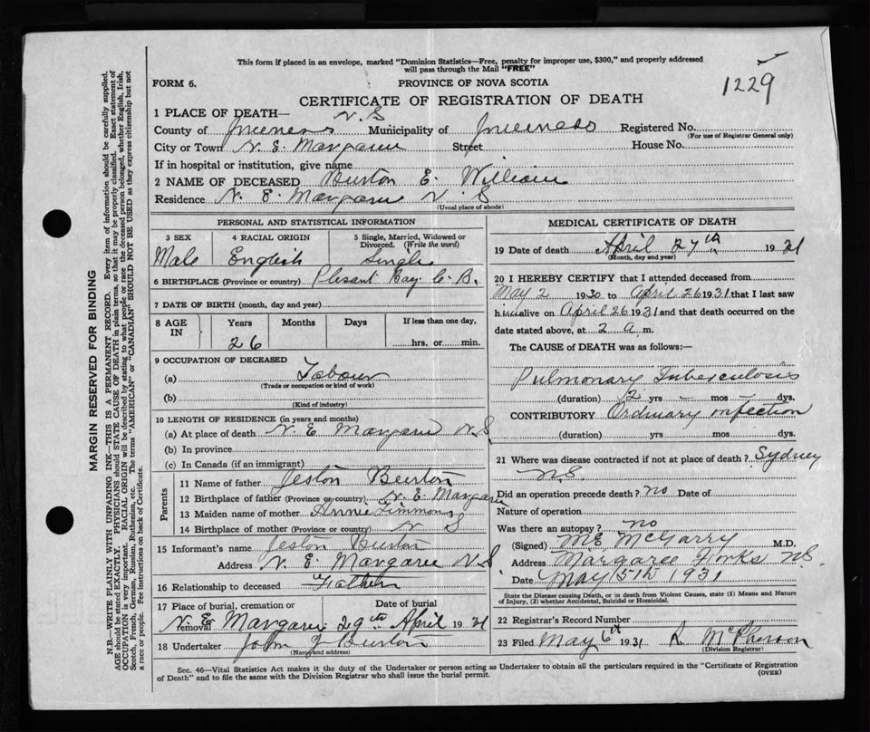 Male Death Registration: Year: 1931 file: 125 number: 1229