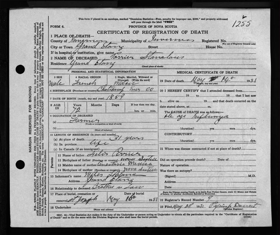 Male Death Registration: Year: 1931 file: 125 number: 1255