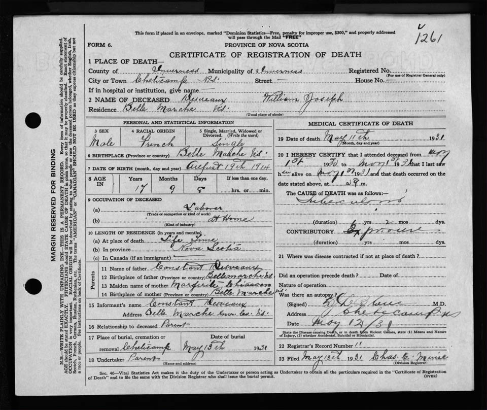Male Death Registration: Year: 1931 file: 125 number: 1261