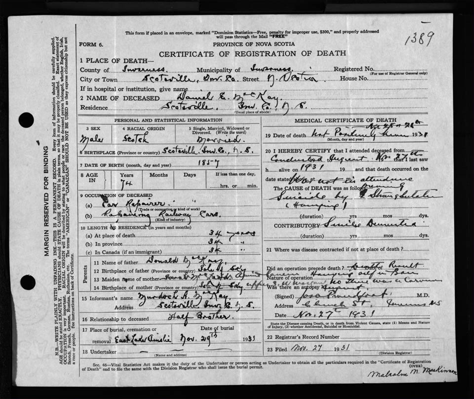 Male Death Registration: Year: 1931 file: 125 number: 1389