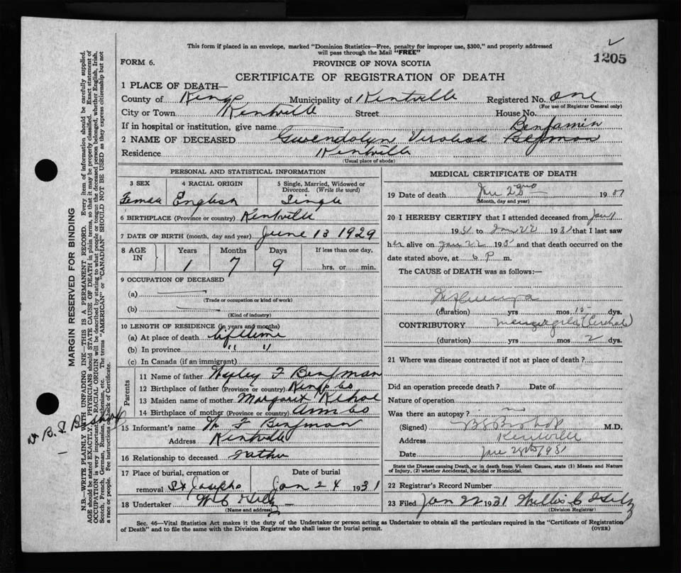 Female Death Registration: Year: 1931 file: 126 number: 1205