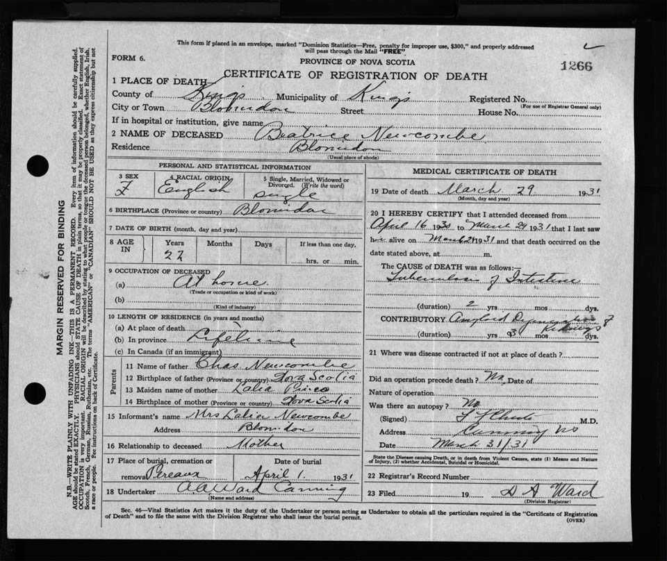 Female Death Registration: Year: 1931 file: 126 number: 1266