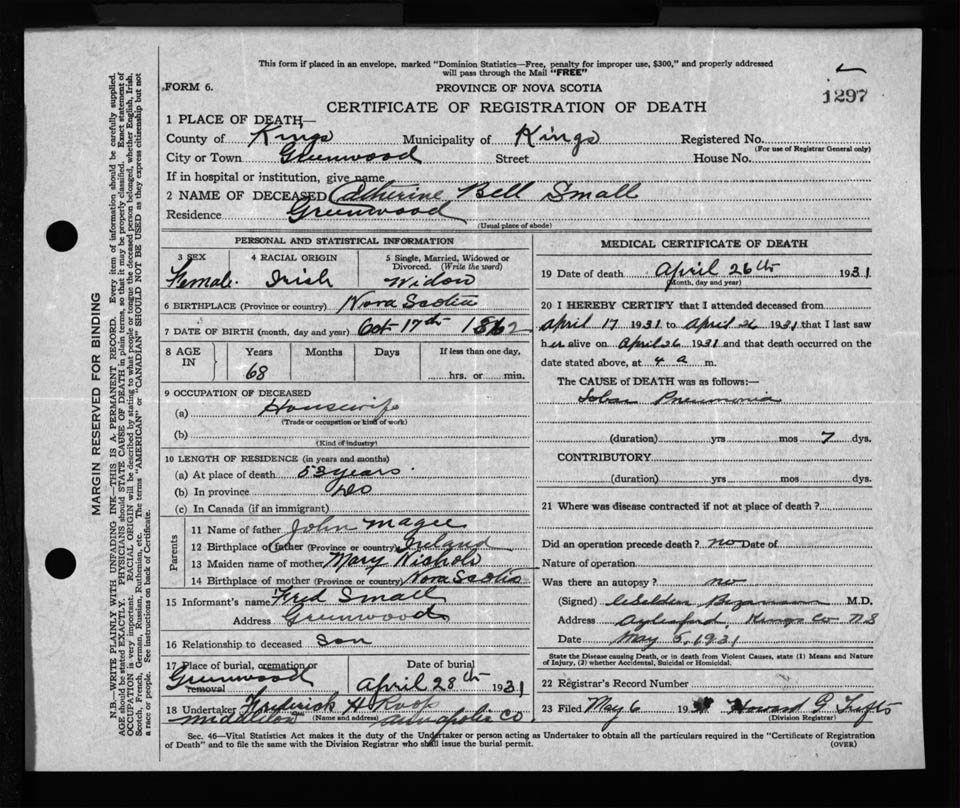 Female Death Registration: Year: 1931 file: 126 number: 1297