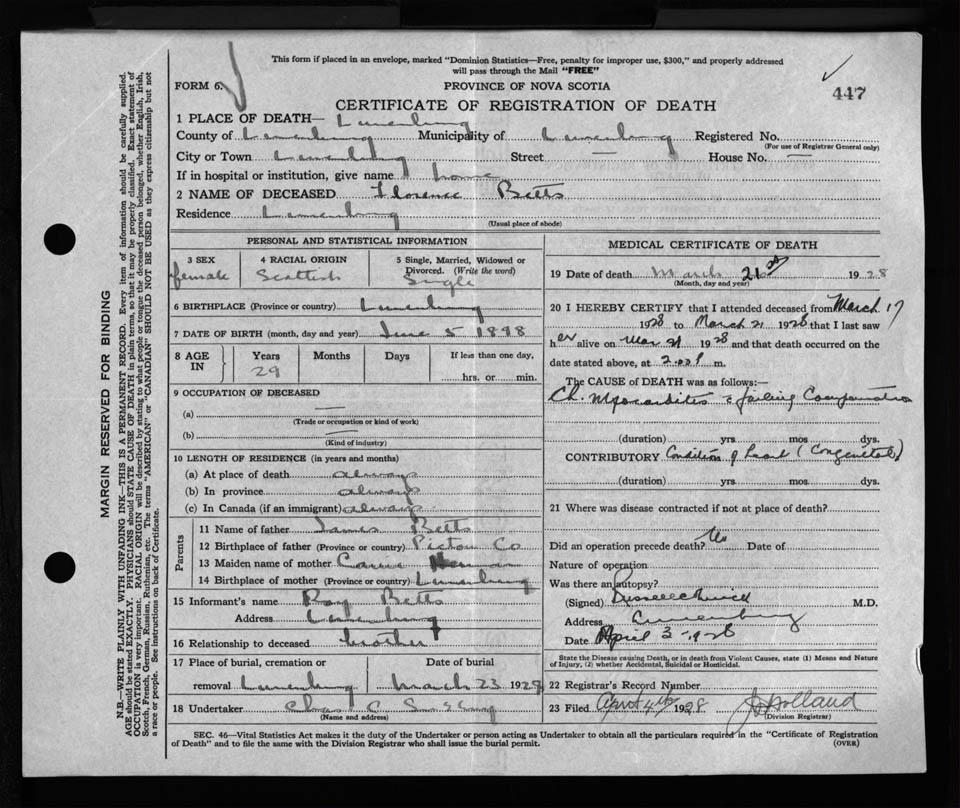 Female Death Registration: Year: 1928 file: 127 number: 447