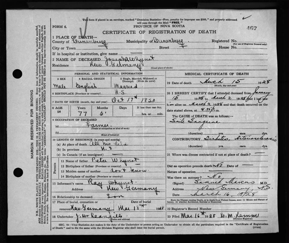 Male Death Registration: Year: 1928 file: 127 number: 467